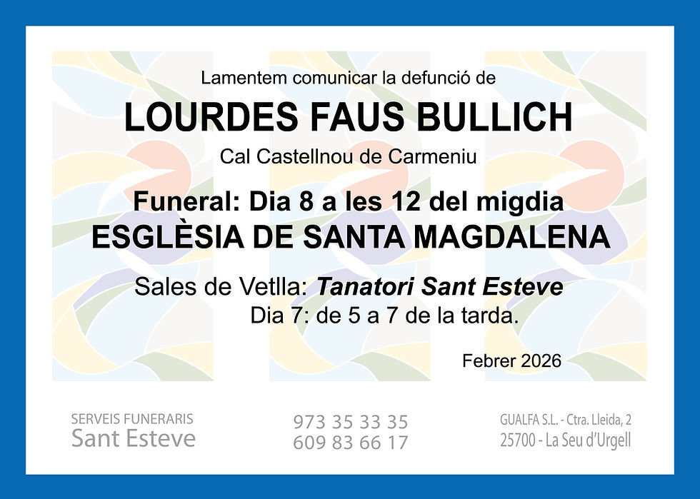 Lamentem comunicar la defunció de la senyora Lourdes Faus Bullich.
